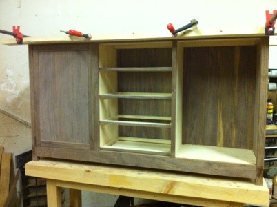 I feel like I’ve been writing about a proper fitting on this piece forever… At least I’ve knocked out a bunch of other projects while working on this one. This time I really mean that I’m onto fitting. Currently in clamps are the final structural elements of the cabinet. The studs from yesterday stiffened up the piece enough that I can avoid the hidden 5th leg. I could probably finish up all of the fitting today, but with temperatures near 90 degrees and no ac or moving air in the shop, that activity will have to wait until next weekend.