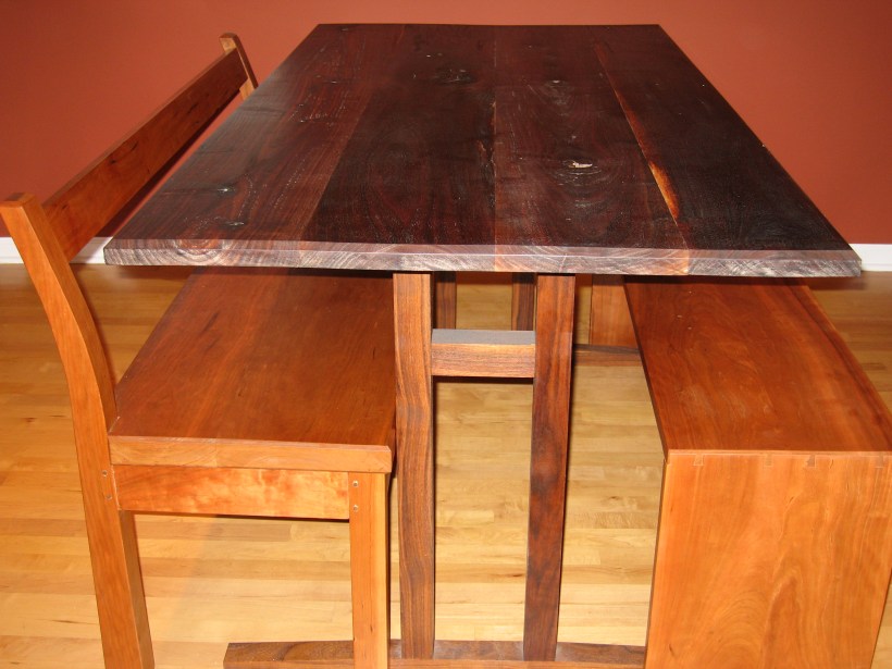 The trestle table is made of solid walnut. It is inspired by the simplicity of the Shakers and the straight lines of Asian furniture making. It naturally seats 4 people, 2 on each opposing side of the table. The table can accommodate 6 by locating chairs at either end of the table. The table features 2 trestles and 2 stretcher beams all of 2″ think walnut joined by 12 mortise and tennon joints. The table top is solid walnut with a chamfered edge featuring knots and sapwood to make a unique statement. The table is finished simply with tung oil.