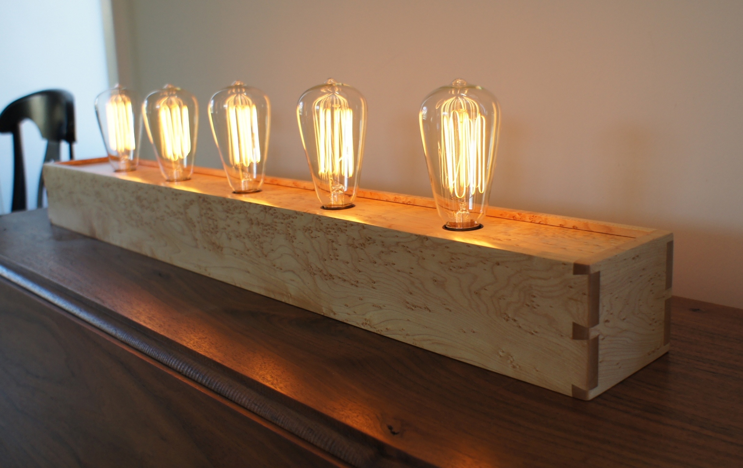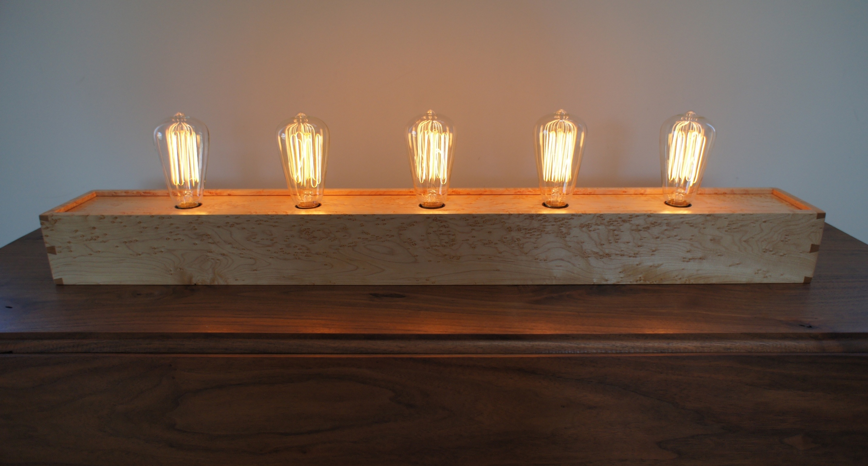After a combination of boiled linseed oil followed up by an oil / urethane blend, I finally finished up the birdseye maple lamp. This is the first version of the lamp that I built with a dimmer switch. I’m sure it’s not evident from the photos, but the switch makes a tremendous difference. The bulbs can put off a lot of heat, and the dimmer allows you to dial in the brightness to just the right level. I’m pretty sure this will be a standard part off all future builds.