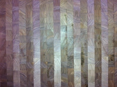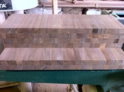The process from there is to basically run these blanks through the table saw to cut the final end grain strips. The 7 blanks I made yesterday yielded 51 strips of end grain. The first photo shows them lined up. The problem is that to get the best look you need to randomize the pattern. This is basically a process of putting them in random order and rotating some strips 180 degrees. Ultimately that leaves you with a more pleasing panel like in the bottom photo. Currently the top is in 4 big pieces. After then next shop visit the top should be finished.
