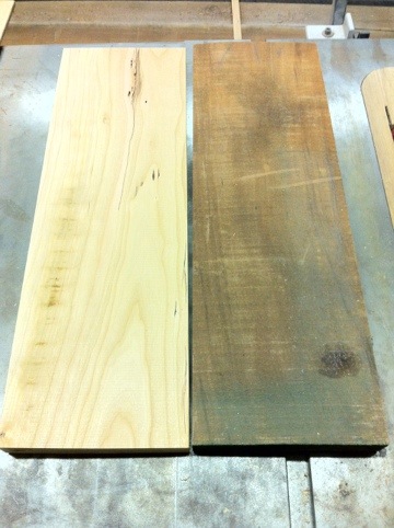 My big pile of cherry lumber. Finally starting to work my way through it. In its rough cut state it certainly doesn’t look like much. Shockingly the retail price for that stack would be way over a thousand dollars. Thank god for Craigslist and people that have trees fall down… To give you a sense of what it looks like after going through the planer, take a look at the second picture which has a before and after piece side by side.