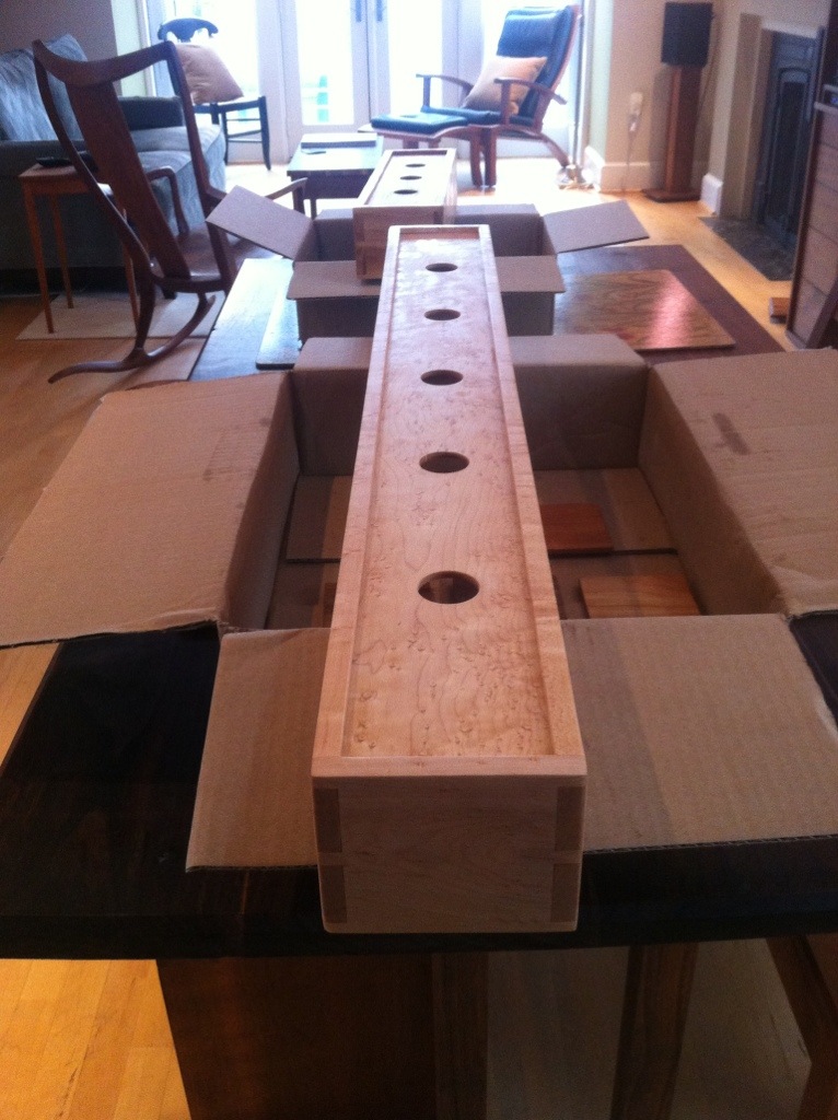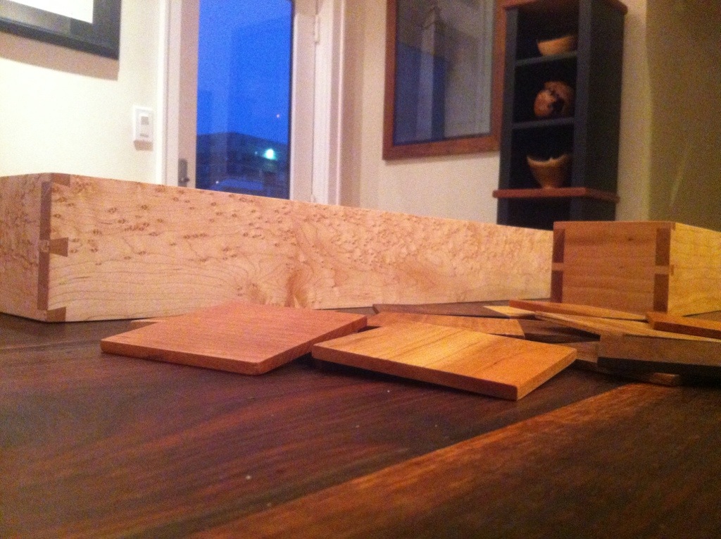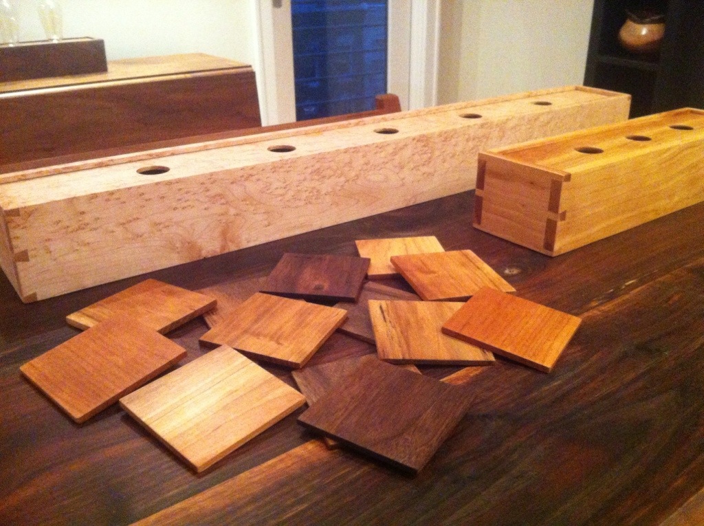The final photo is the output off a long weekend in the shop. The two boxes are awaiting 5 holes each for light bulbs. The lamp on the front right really highlights matching the top and front grain patterns. The scattered 44 coasters are from excess lumber from the past 5 or 6 lamps.