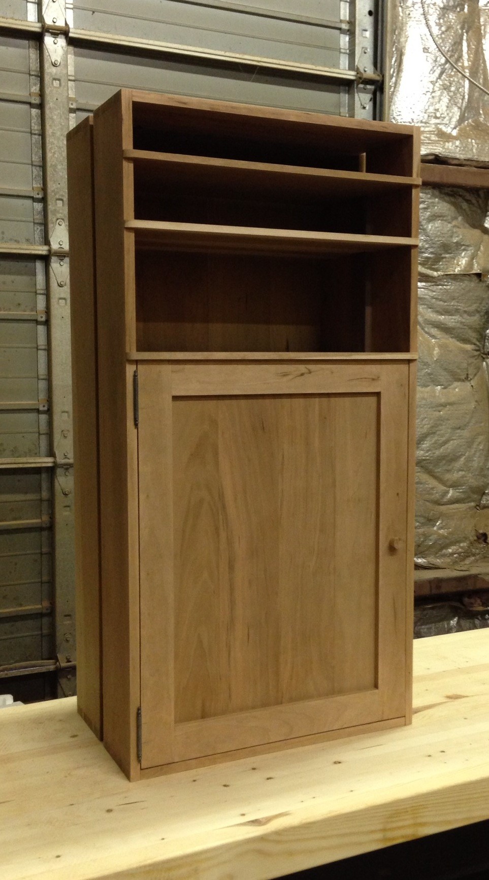 Earlier this year, I finished a new entertainment center. You can see pictures of that piece in this post. It is built of solid cherry and has 2 major pieces. The main body that supports the stereo equipment and the turntable is just a large through dovetail case. For those reading this that mainly know my lamps, this is basically the body of an Edison lamp (but a lot bigger). The dovetails are visible when you are viewing the piece from above or the side. They don’t do anything special in the function of the piece, so they are largely form over function. There is some function in there too though… The dovetail is great for ensuring a 90 degree angle in the corners, and it is much stronger than other joints than I can use.