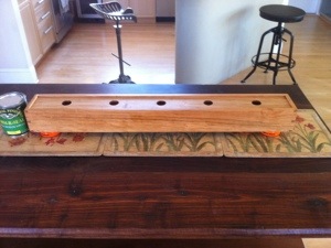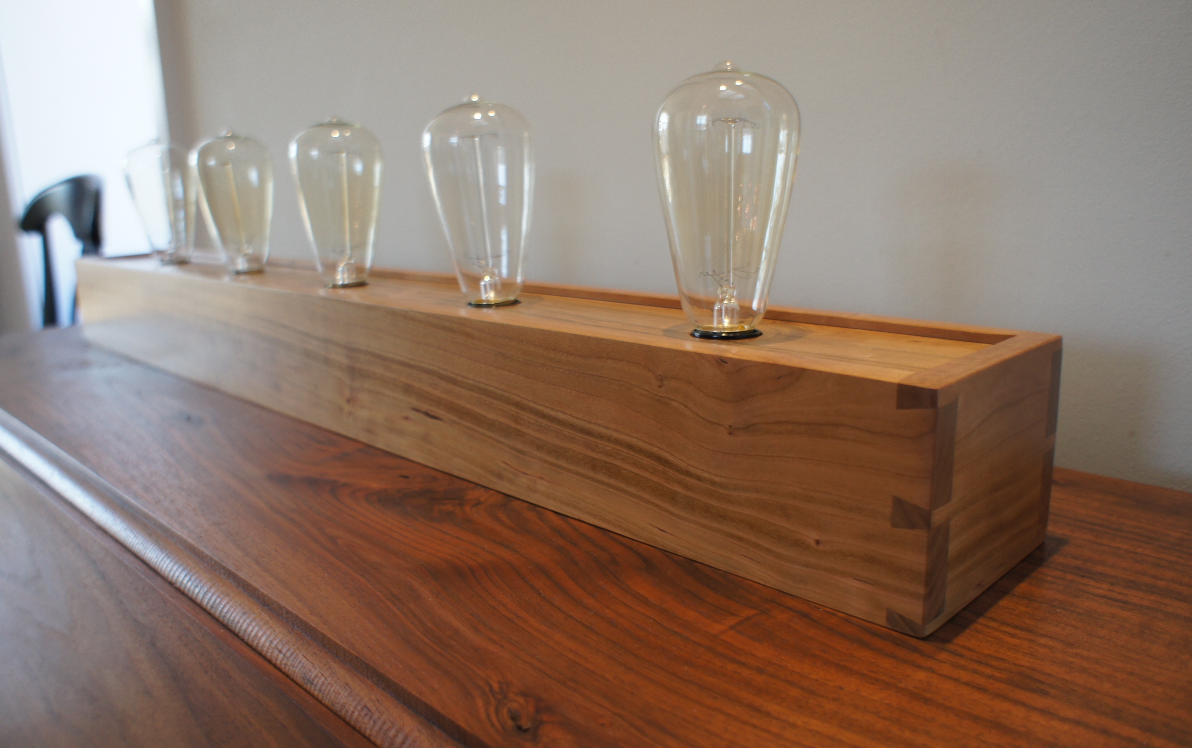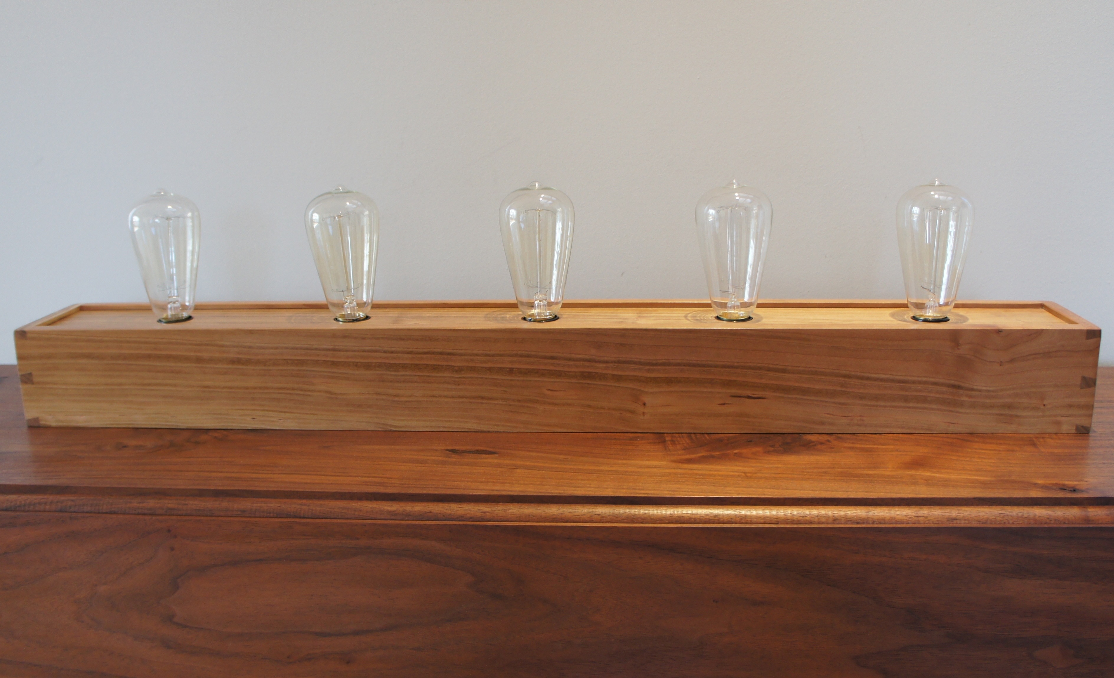 Put the finishing touches on the 5 bulb / 36″ version of the latest Edison lamp this weekend. The final piece has three coats of finish applied. It already has great color, but the cherry will continue to darken with exposure to natural light. I mentioned a few posts ago about resawing the lumber so that I could get the top cut from the same piece of lumber. In addition to the benefit of matching tone and color, it also has the benefit of matching the grain and streaking of the board used for the front of the lamp. It will be sad to pack it up, but it will have a new home in its future…