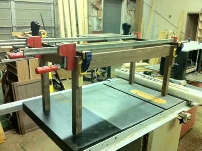 A long business trip to Indonesia has resulted in this project taking a few weeks longer than anticipated to finish. In the picture below is the dry fit of the coffee table base. When working solo it is great to practice with the clamps before adding glue to the mix. This one was fairly straightforward thankfully. It should be dry by the morning. Then it’s only sanding and finishing left.