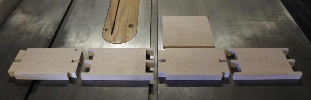 After a lot of math and woodworking, I was able to get the lamp into the clamps. The first photo shows the sides of the lamp before it’s pieces are cut to length. My goal is to always get the lamp out of a single board. By using a single board, you can have the grain wrap around the piece. Unfortunately, I had to use a different section of the board for the thin top piece. The lumber just wasn’t thick enough to get it out of the same section of lumber. When I get it out of the same board, I at least attempt to match the top to the front of the lamp. When it works properly, you get a top that is bookmatched to the front. The second photo shows the lamp after the dovetails have been cut. It’s been a long time since I’ve used the 7 degree dovetail bit, but with my jig it’s necessary for stock this thick. Hopefully, soon I’ll have a post on this site that isn’t just WIP…