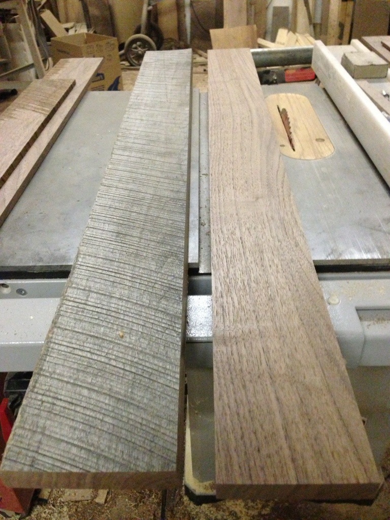 I’m finally building a 5 bulb Edison lamp out of walnut. I’ve been wanting to do a walnut version for a while now, and thankfully I just got an order for one through my shop on etsy. I’ve been working off of the same stack of walnut for years now, so I have a fairly good idea of how it will look when dressed. If I hadn’t been working from this same tree, I would be flying blind. In the photo below, you can see the board I used to construct the case. The board on the left is rough sawn; I haven’t done anything to it yet. The board on the right has been passed over the jointer (both to expose the beauty of the walnut and to flatten one face / square one edge). Sometimes you don’t know what you’re going to get until the lumber hits the jointer.