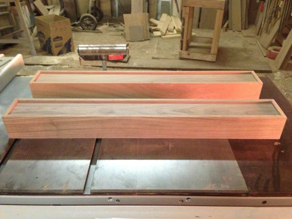 From there it was on to my normal sequence of planing, dimensioning, routing and assembling the case. I’m not going to detail those steps here, but there are plenty of other posts on this site that show those steps. Ultimately, I got to the point where the 2 boxes pictured below were ready for sanding. I decided I would add another lamp to the weekend build. Once you go through the steps to setup tools to build one, you feel like you might as well build a second one too. The box in the back is made from sapele. I’ve never worked with sapele before, but it seemed like I was getting a good deal on the lumber (and you can build an entire lamp from one board). Unfortunately, the photo isn’t the best… The ceiling light in my shop is not great, so the photo is overly lit by my space heater. As a result it’s hard to see any details or the colors of the lamps. Once I get to the finishing stages, all of the details will become clearer.