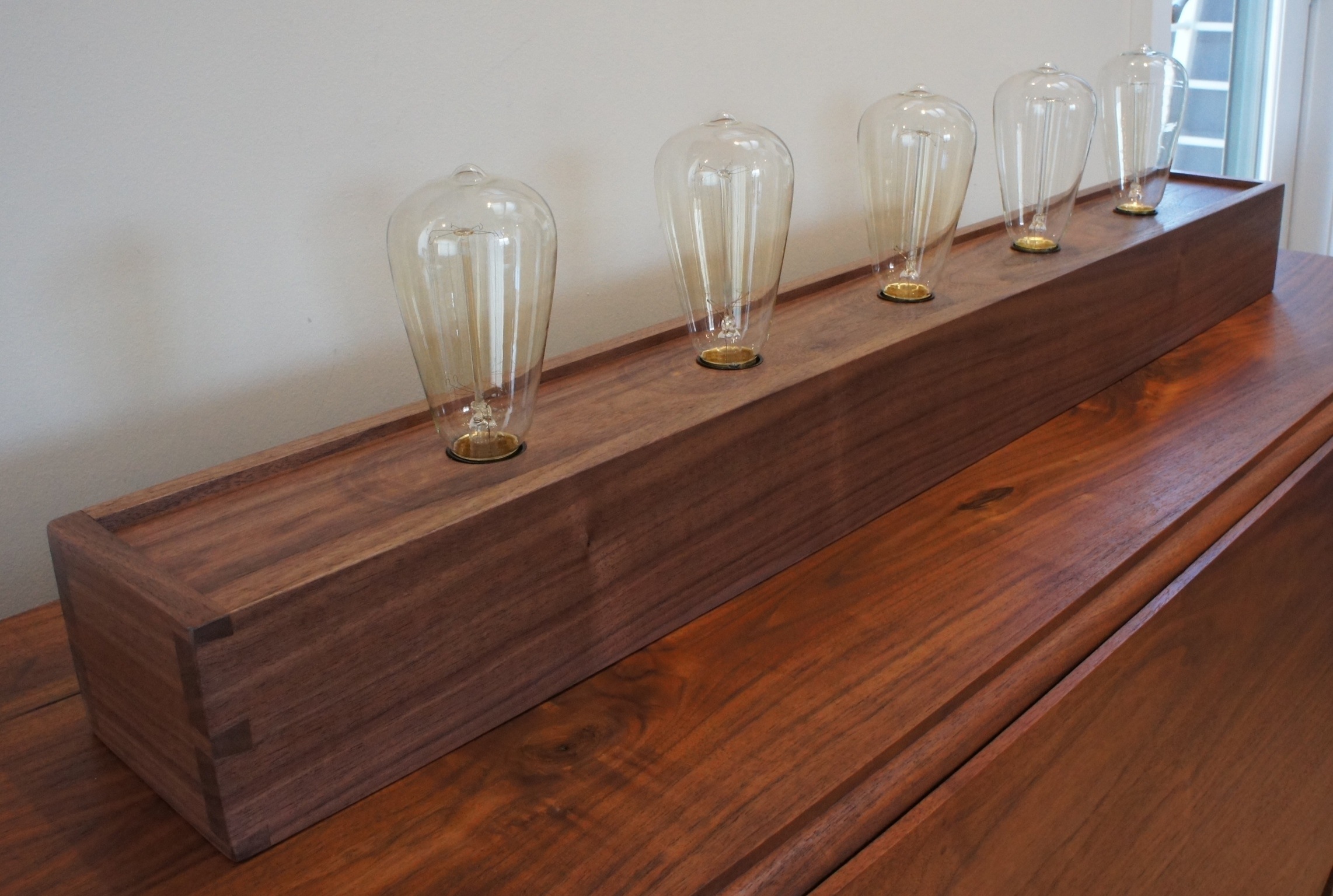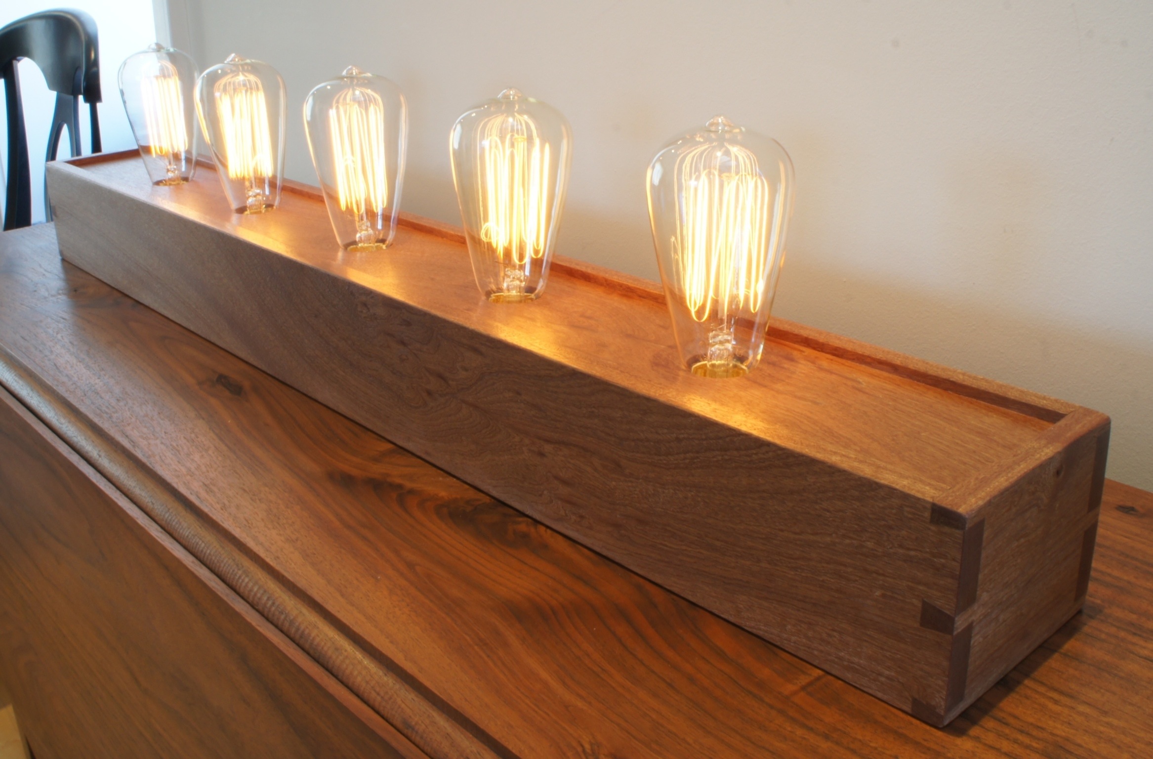 Just a quick post tonight to show the 2 most recently completed lamps… The walnut lamp was built for a customer and features my traditional Edison lamp design. On the sapele version I’ve switched over to a porcelain socket that doesn’t rise above the top of the lamp base. I really like the look of the bulbs being embedded in the base as a result. One of the sockets must be a tiny fraction of an inch below the surface of the top. As a result I had to really screw in one of the bulbs to get it to work… In the future I’ll have to ease the edges of the opening a bit more or make the top a bit thinner. I built this one to go on etsy and I think it will still go there, but I’ll definitely have to be very clear about how hard you have to screw down the one bulb…